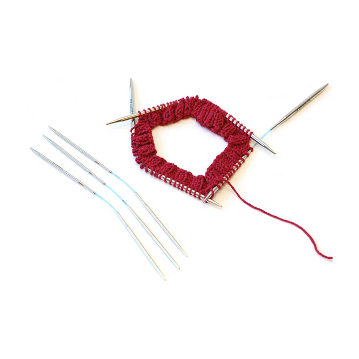 An effortless new method of knitting projects which are worked in the round, these are specially designed flexible double pointed needles. Easy to use, stitches are simply distributed over two needles, and then knit with the third - resulting in only two needle changes per row.