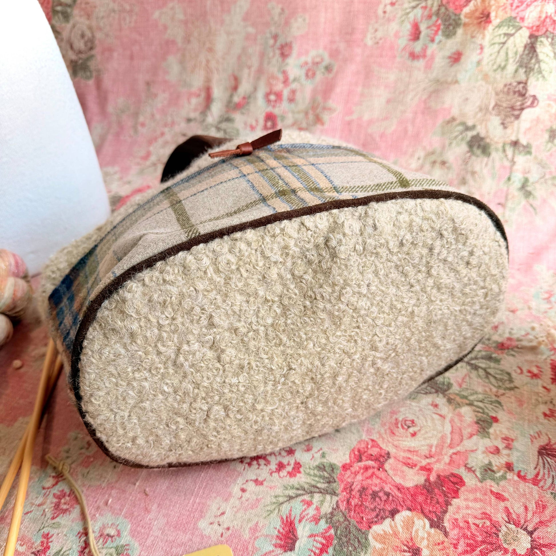 Get ready to tartan the town with the Highland Caddy! This bags consists of a woven wool blend of earthy beige and cool blues, and a short pile cream colored sherpa. This stand-alone, carry around organizer has chocolate trim and ultra suede handles. It has four outside and four inside pockets with an ample center well perfect to store and keep handy all your tools and notions. Dry clean only, Recycled Content.