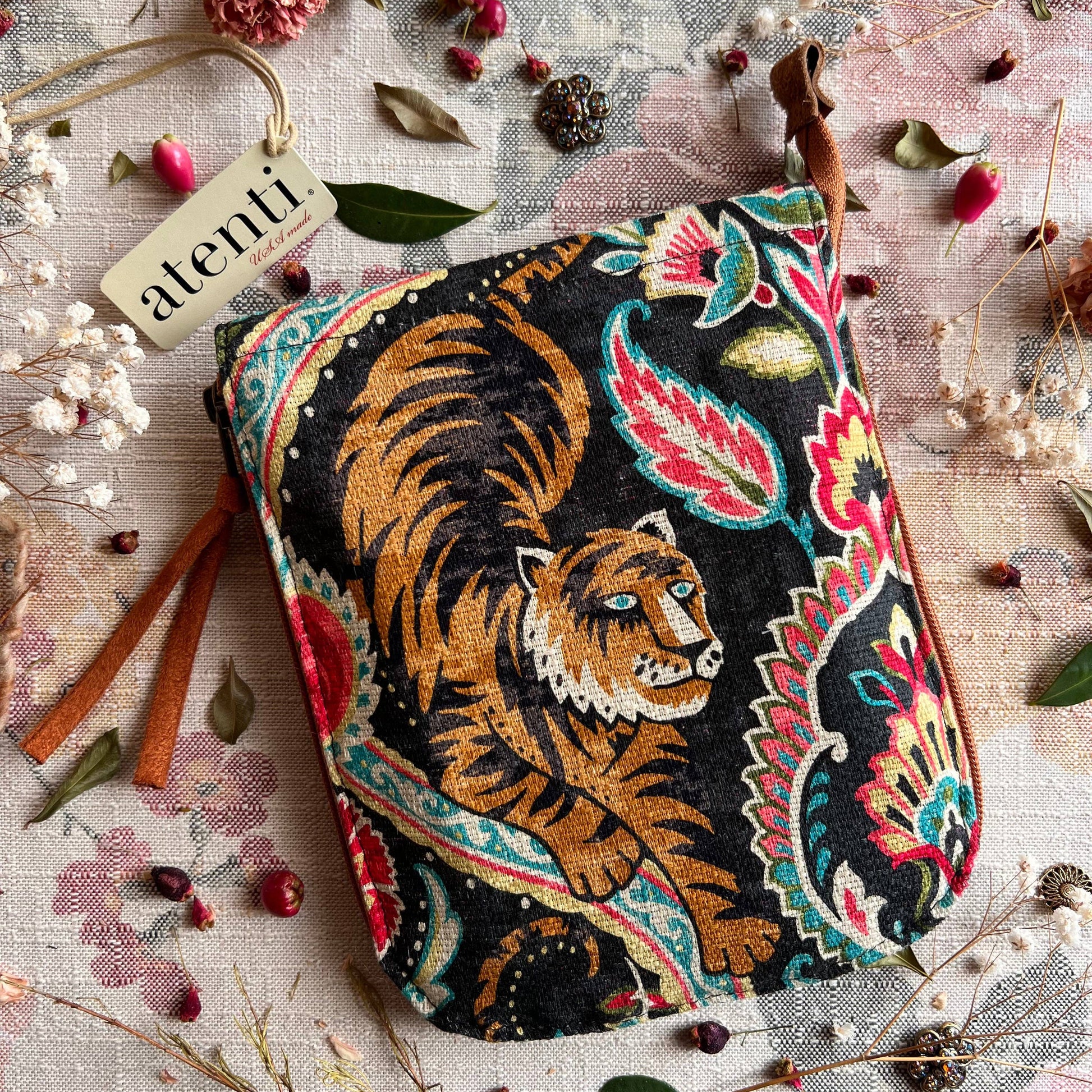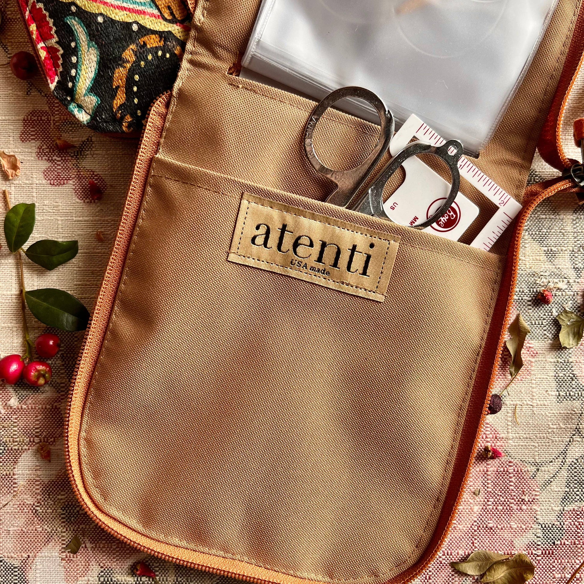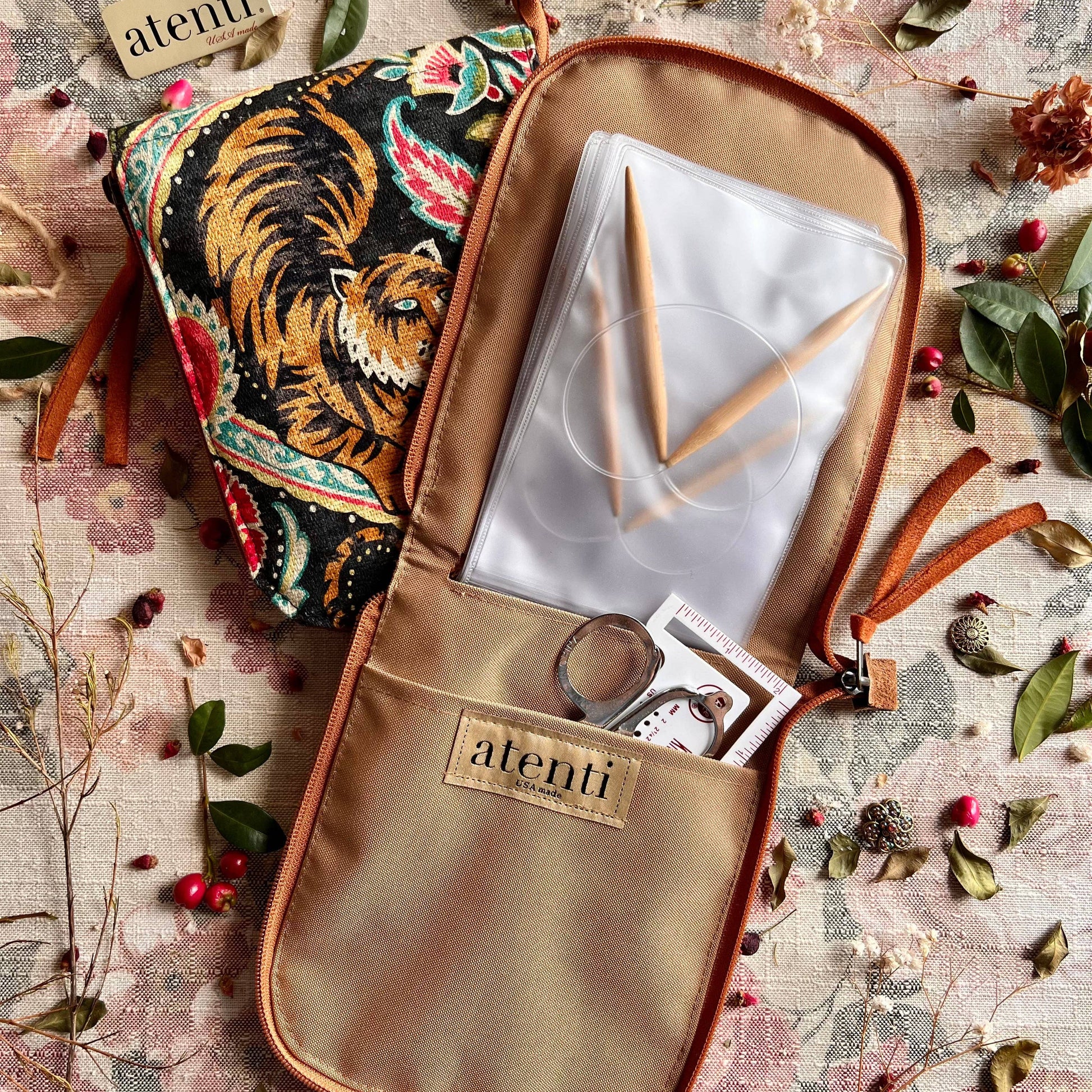 Tame the wild with Jaya! Perfect for any risk-taker, this item features tigers and vibrant flowers on a dark background. A practical organizer and storage for your circular needles in distinctive Atenti fabrics. An all around zipper closure protects an interchangeable plastic booklet insert with 12 clear pockets. Additional insert booklets available. Embrace the wild with Jaya Circular Case!