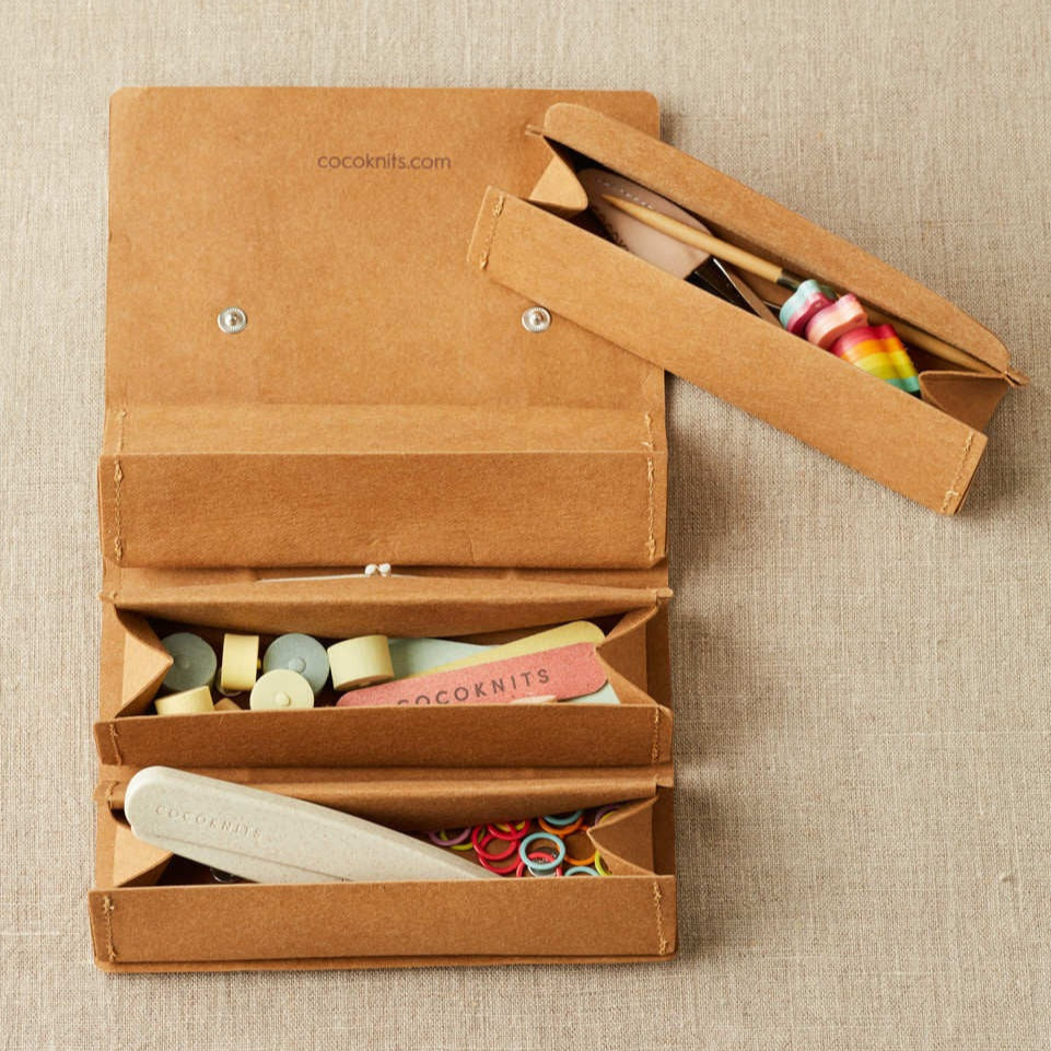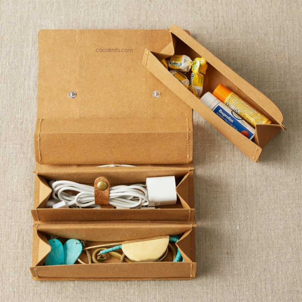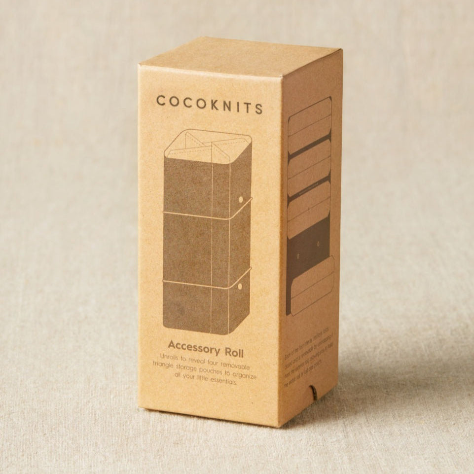 From Julie, owner and designer of Cocoknits: I’ve seen craft tools and other bits and bobs kept in various bags, plastic boxes and pencil cases. None of them felt fun or versatile enough for me. I wanted something that had enough compartments to be organized, could open up so I could see what was where, but could still travel in my knitting bag. I began folding paper, origami-style, until I came up with a simple, long envelope pouch with a nice triangle structure to it. Four of these triangle pouches make a square, and the lovely symmetry of it lends itself to being rolled up! I realized if I attached each pouch to the backing with snaps, I could take the whole roll with me, or unsnap and take just what I needed. As always I wanted it washable and durable, so I made it out of kraft paper fabric, which softens the more you wash it.