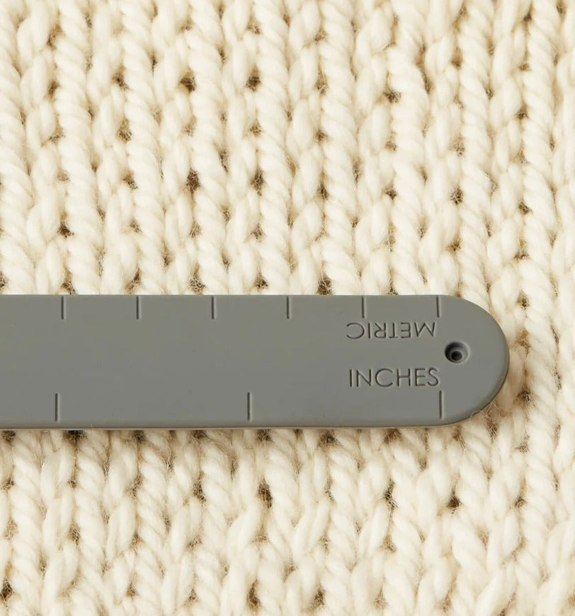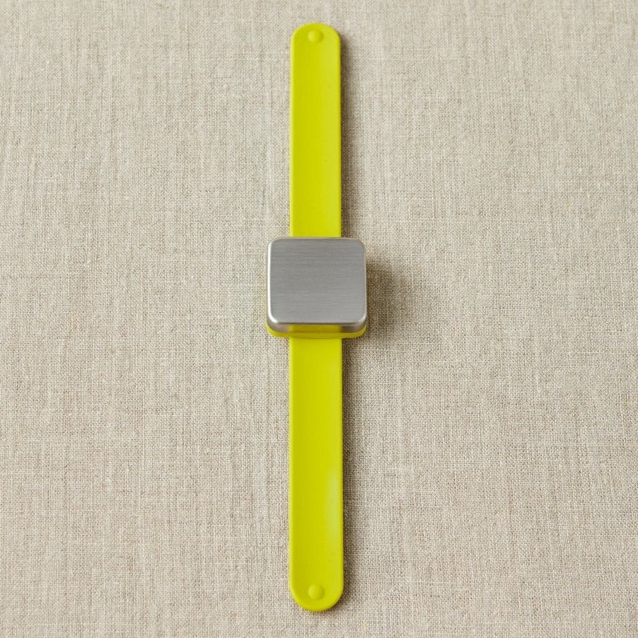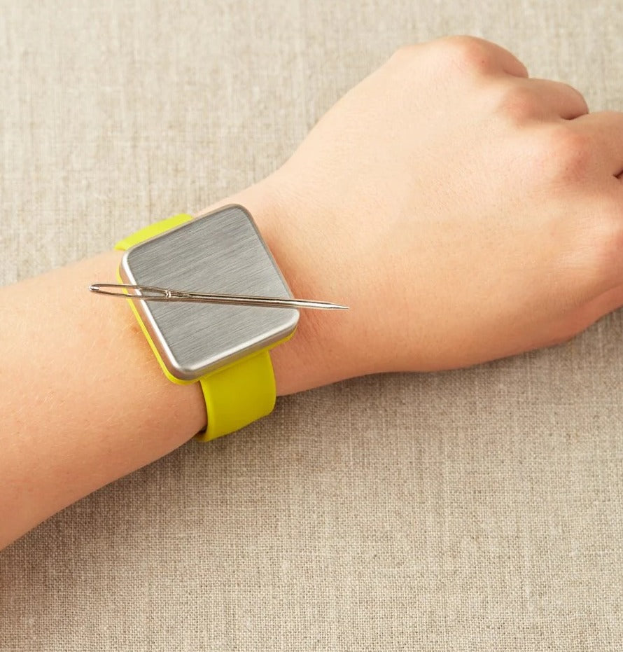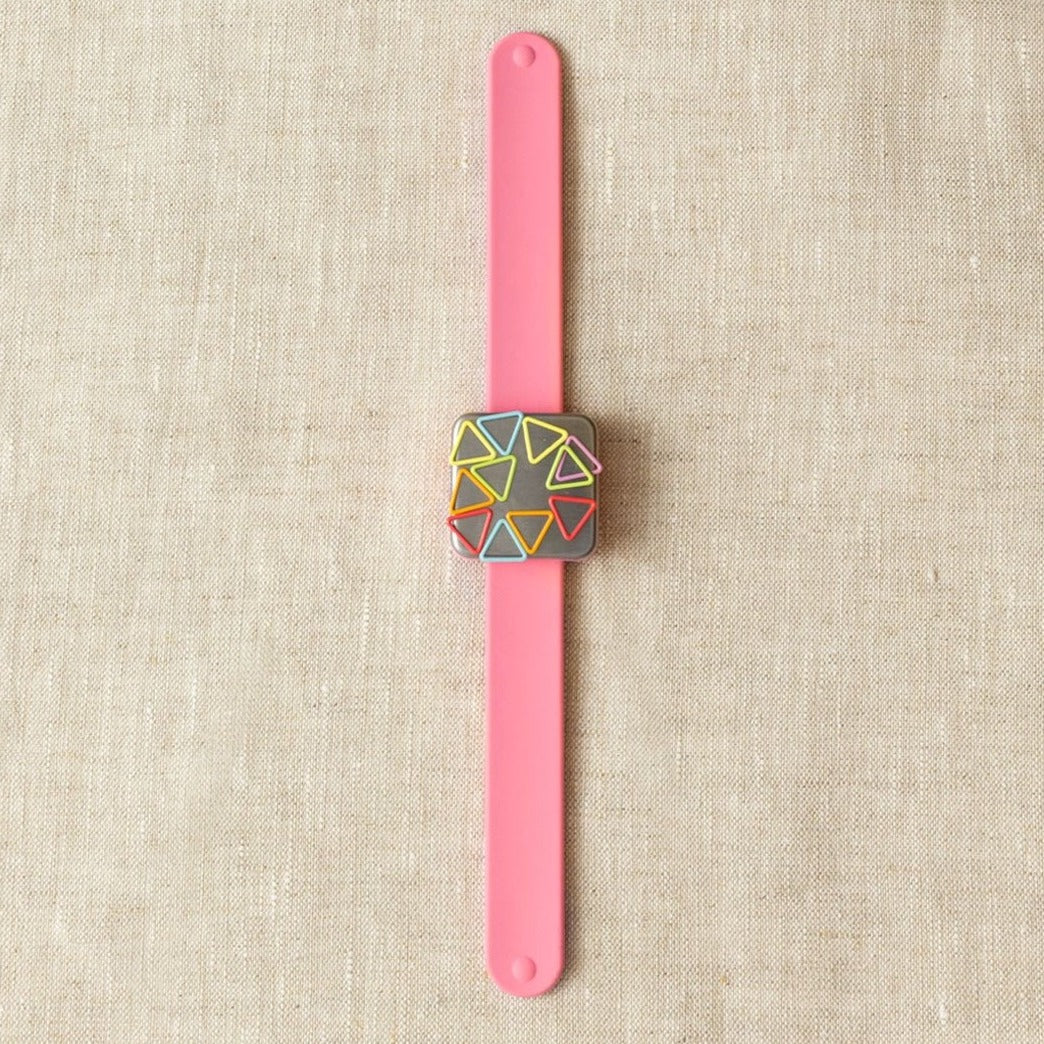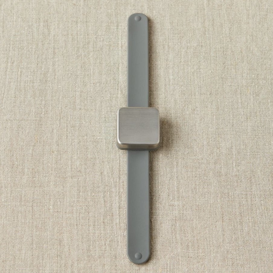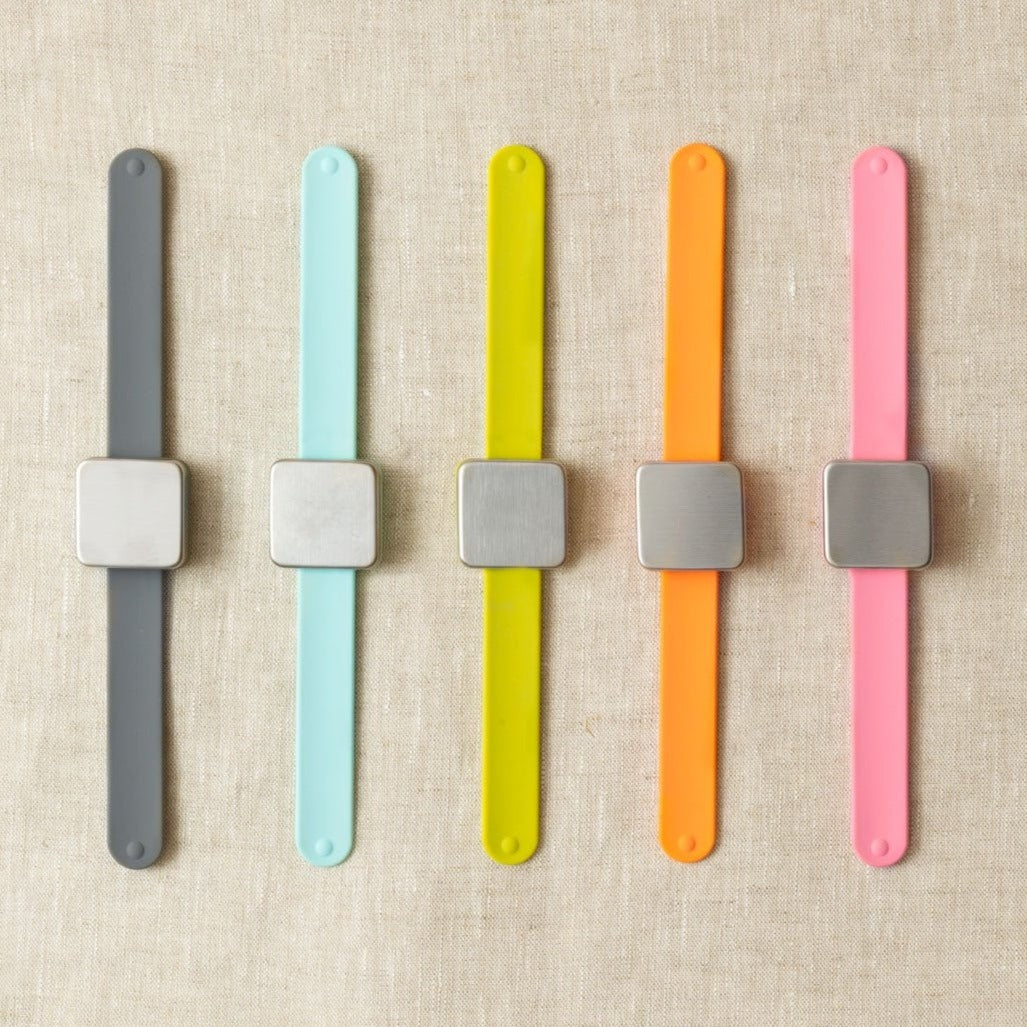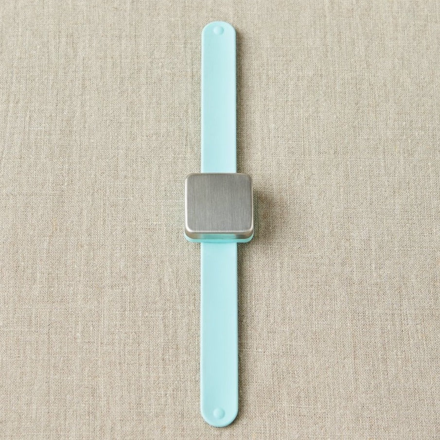 One of the many advantages to knitting is that you can take it with you everywhere! And, in the process, lose little knitting notions everywhere! This is a slap-bracelet so it fits everyone (one size truly fits all here). You can wear it, or simply drop it in your knitting tool bag to keep all the tools together- or even unfurl it and push the magnet to one end to use it as a straight edge while reading down a pattern.