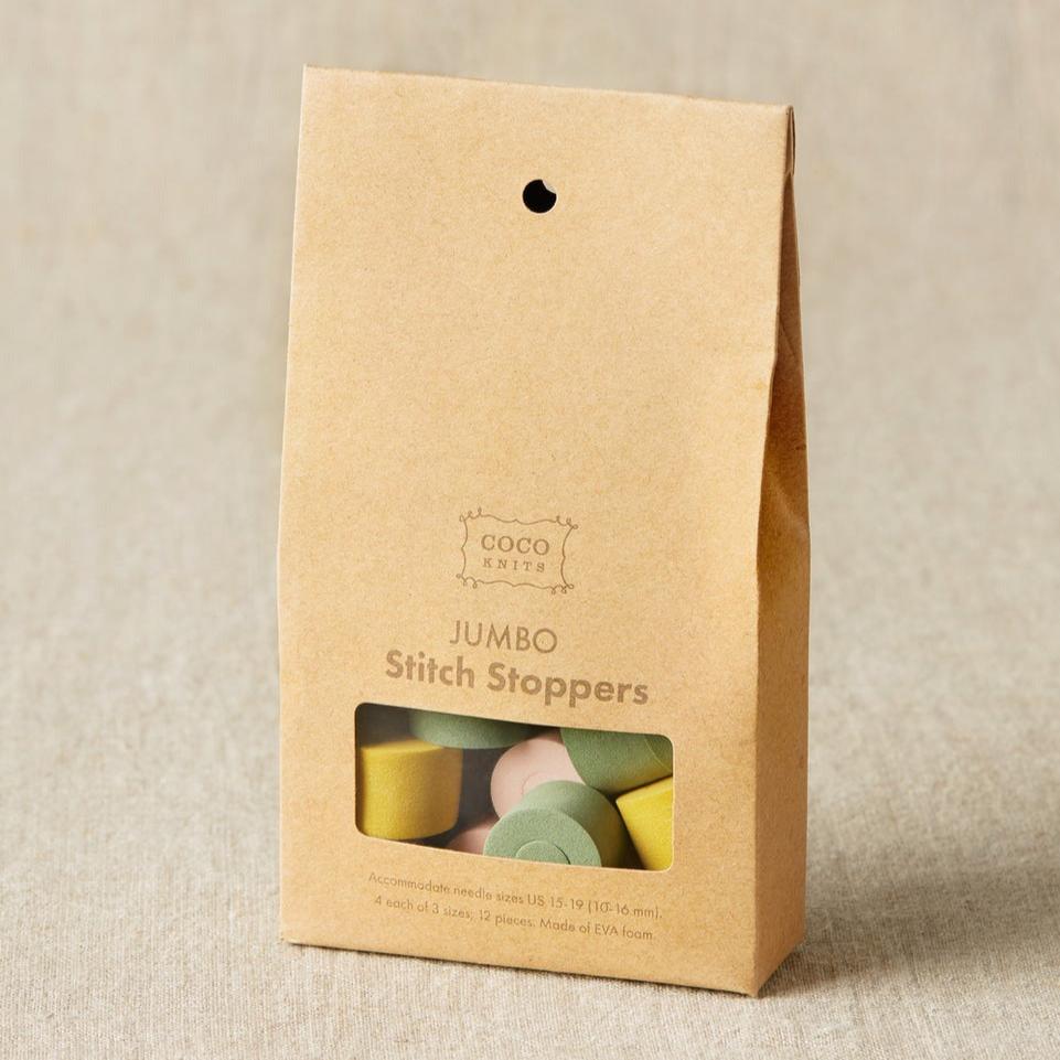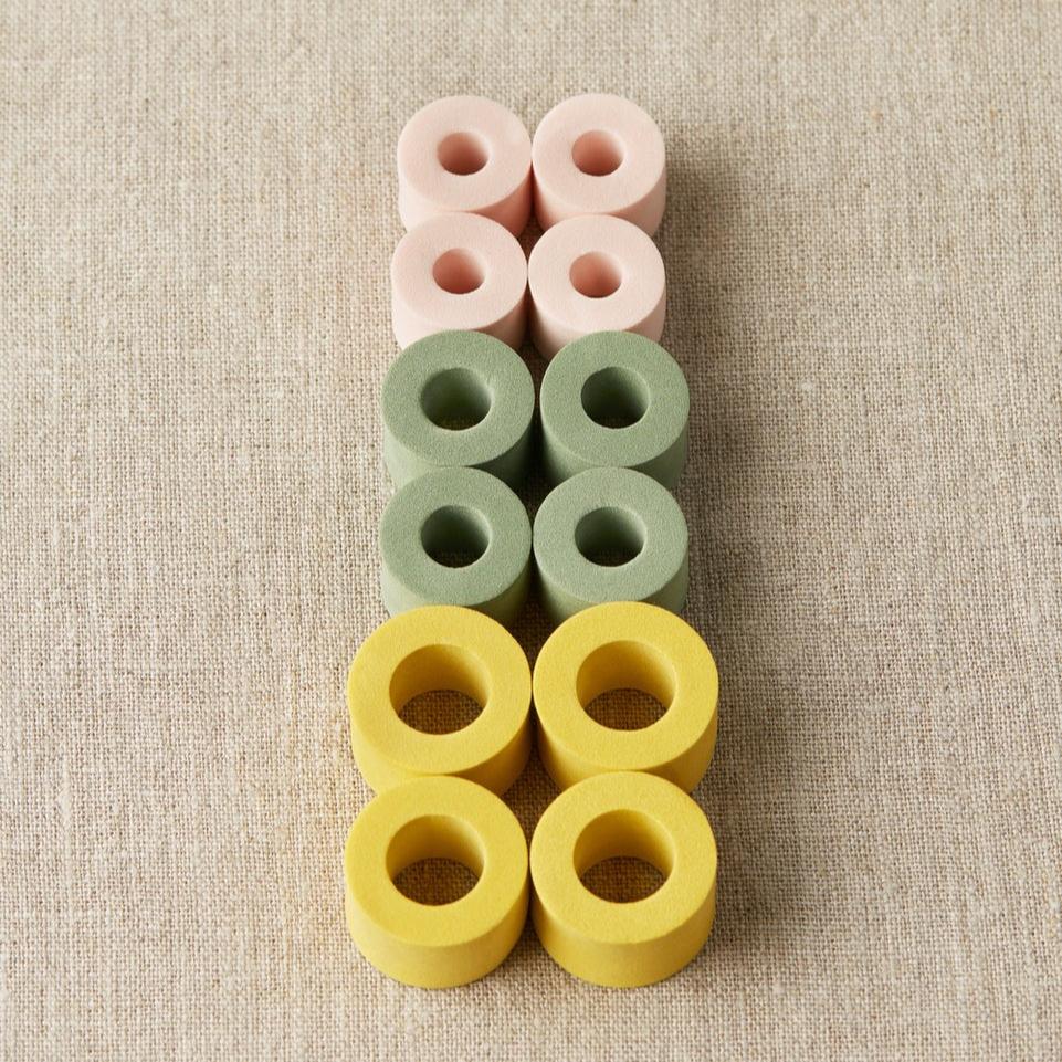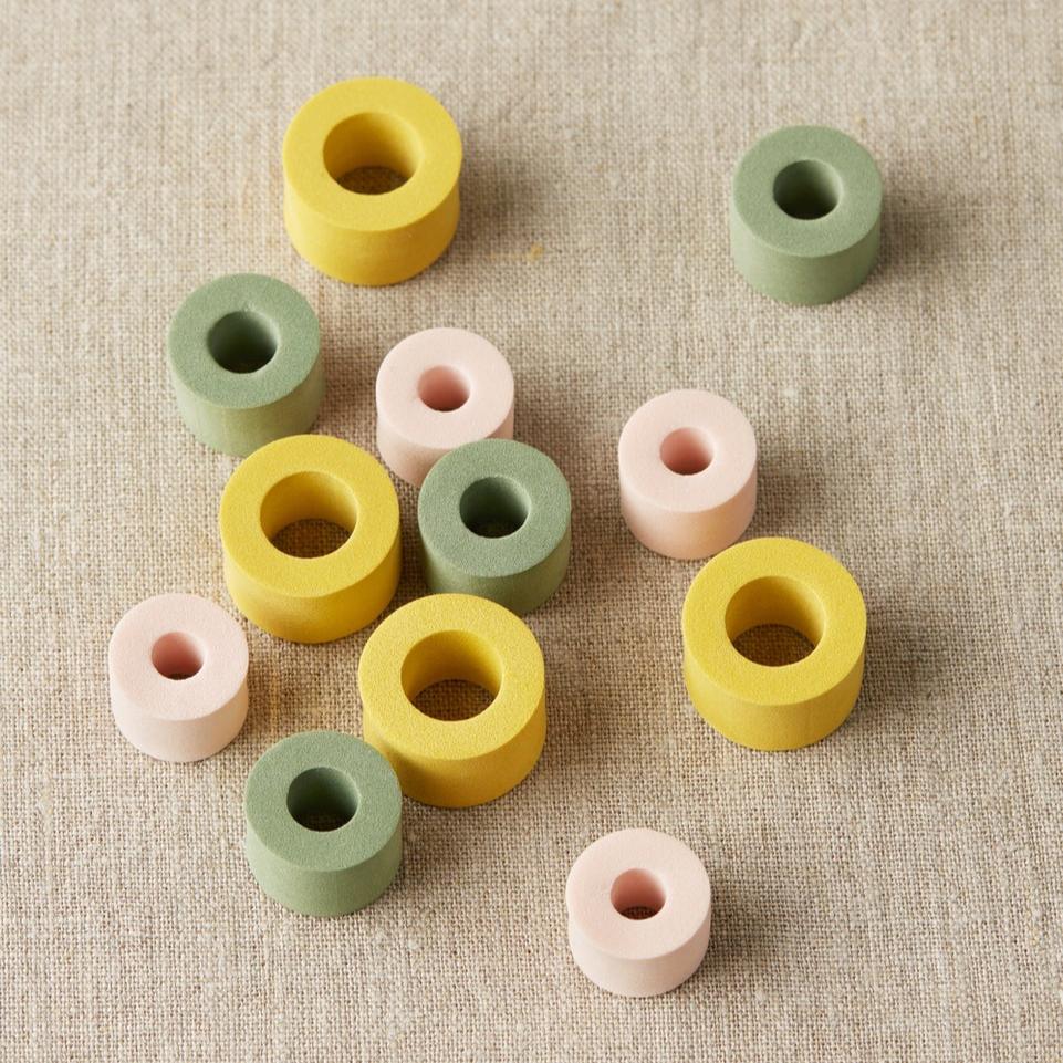Foam stitch protectors that slip right onto the ends of your knitting needles to stop stitches from popping off when you set your project aside.