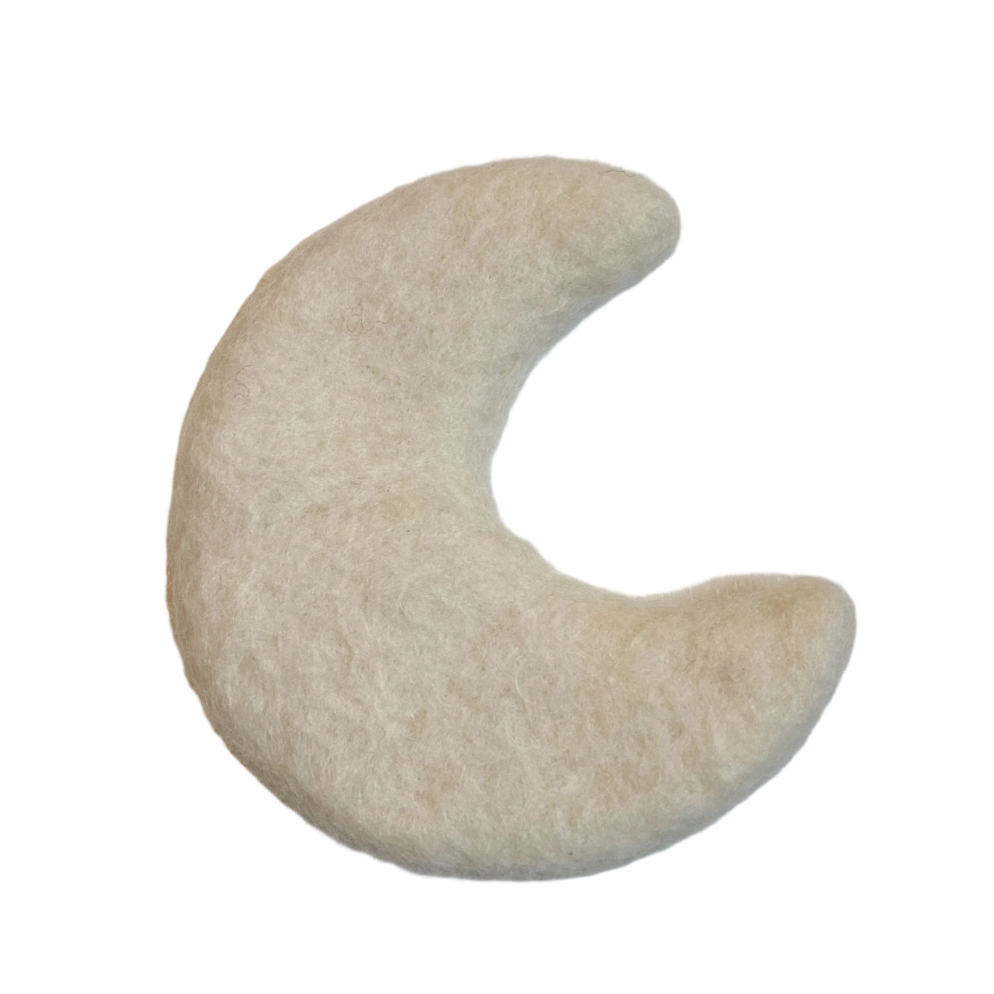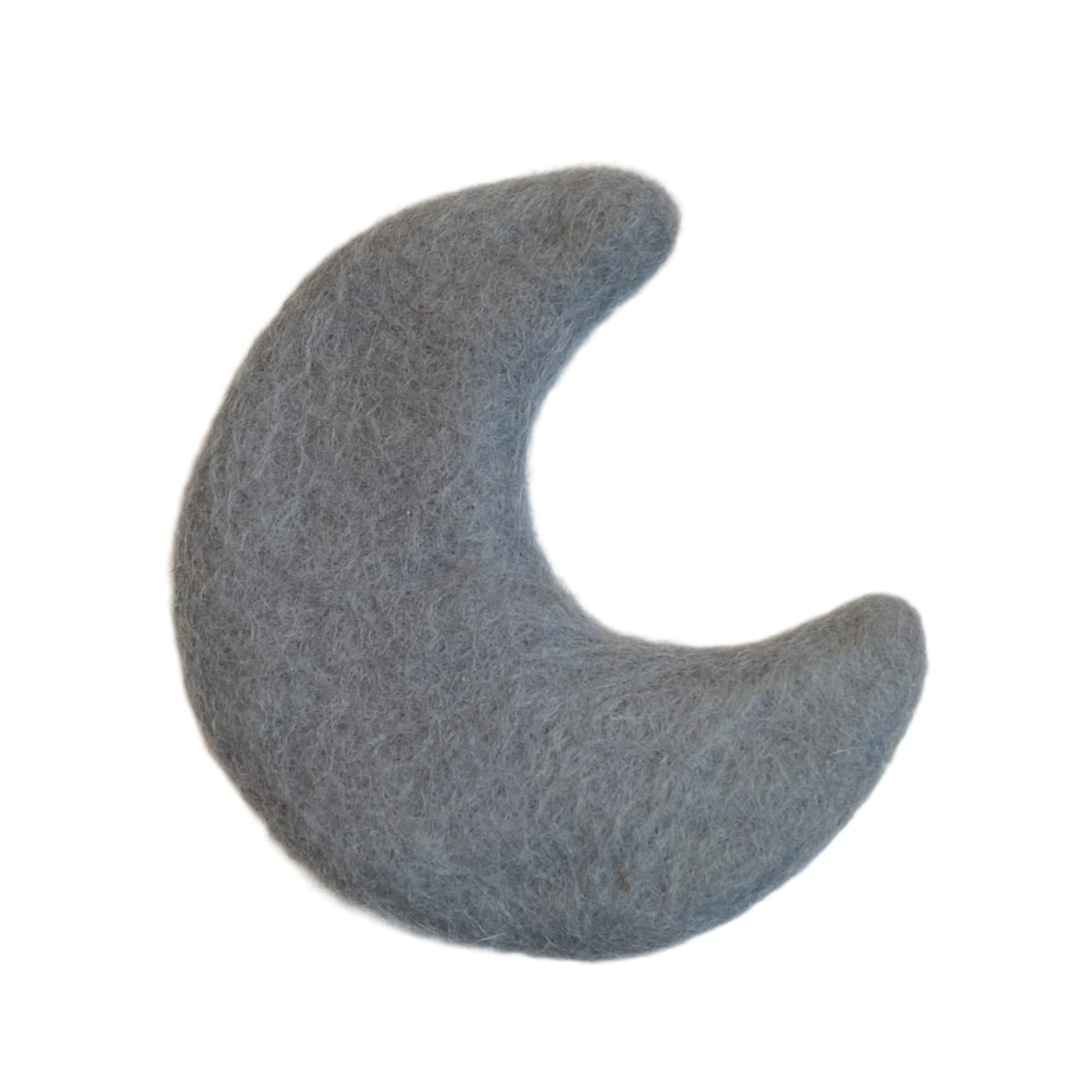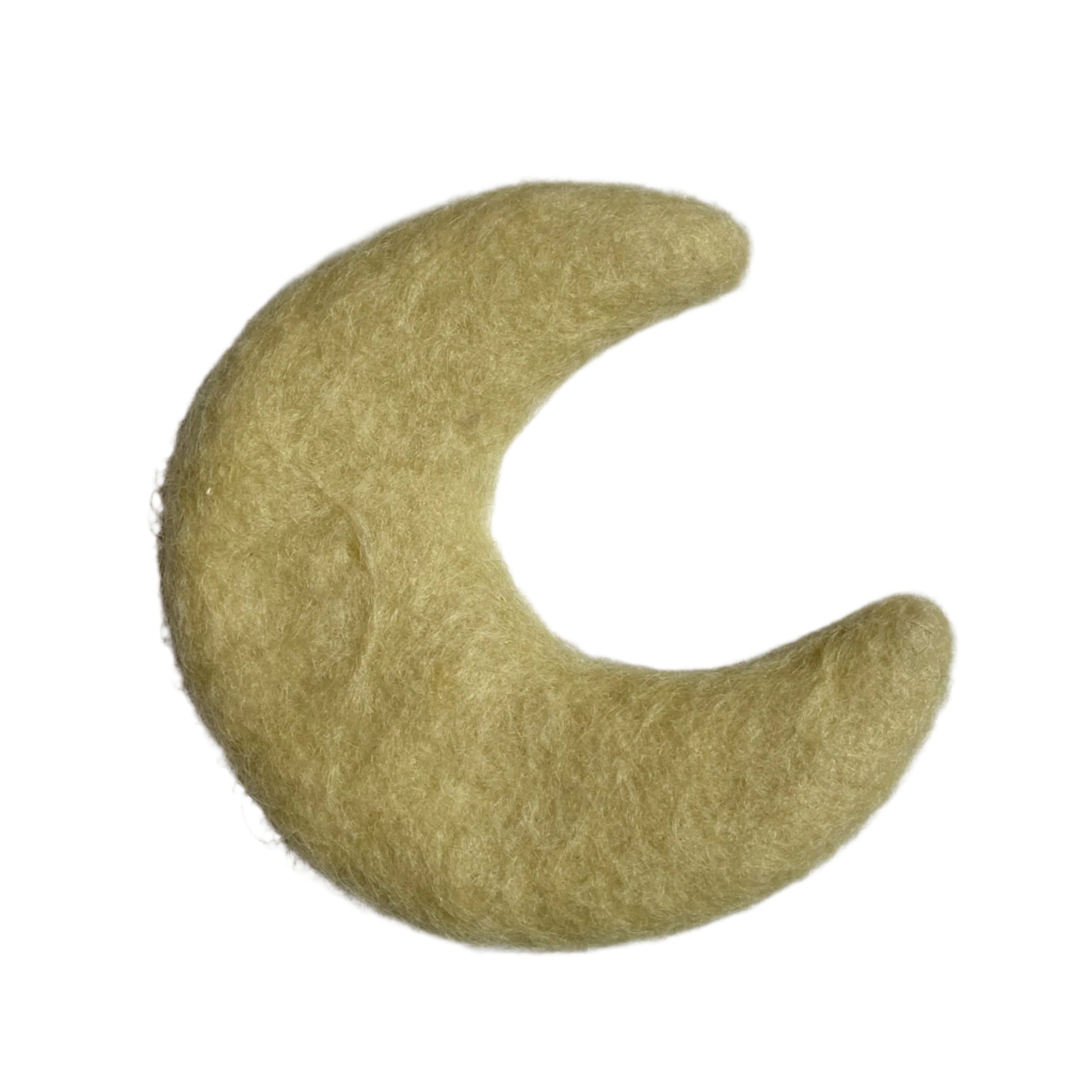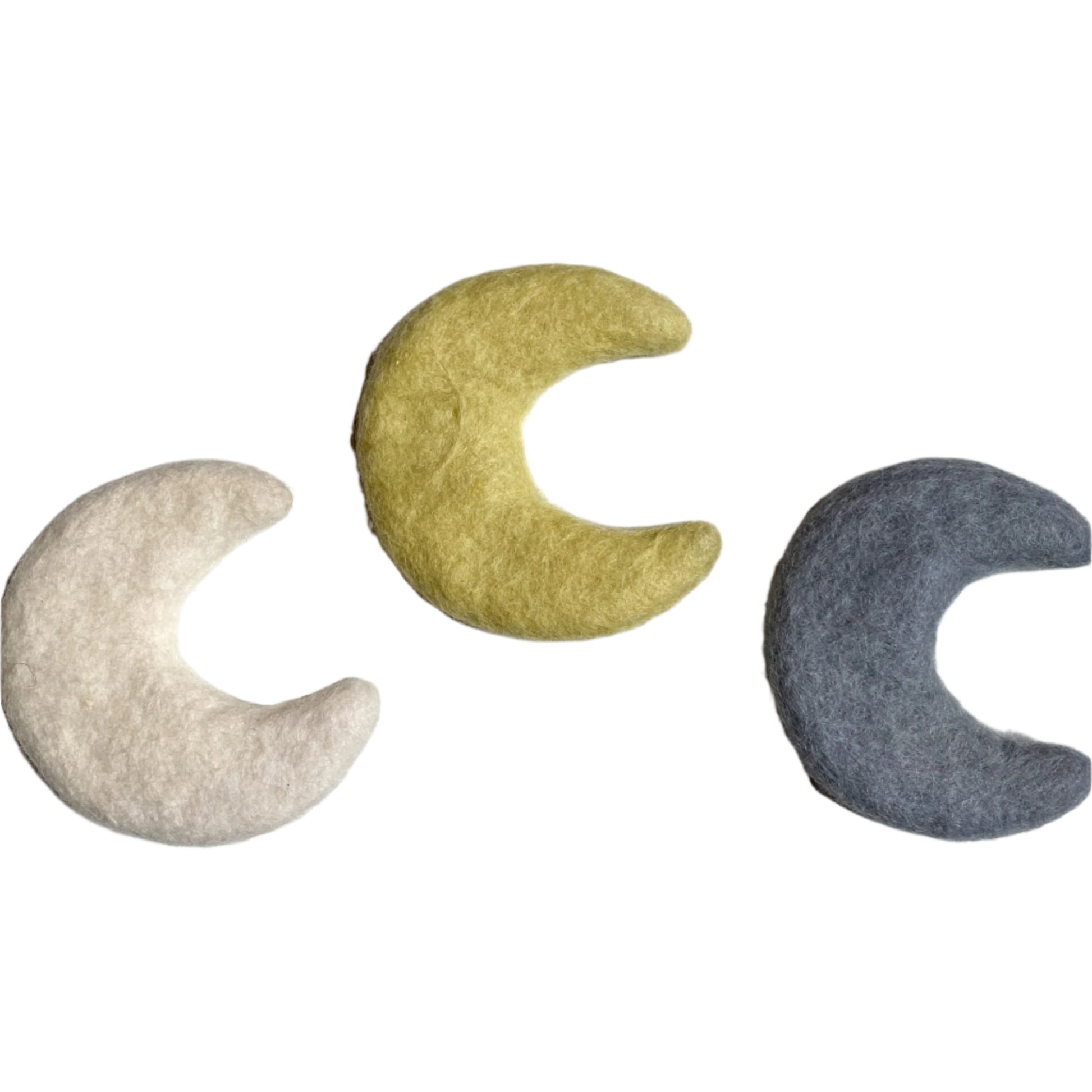 These felt moons are imported from a manufacturer in Nepal that practices fair wages, good working conditions, and does not employ child labor. Felt moons are handmade with 100% wool fibers and wool fibers are dyed using Azo-free dyes. Soap, hot water, and gentle agitation is used to form these felt balls by hand.