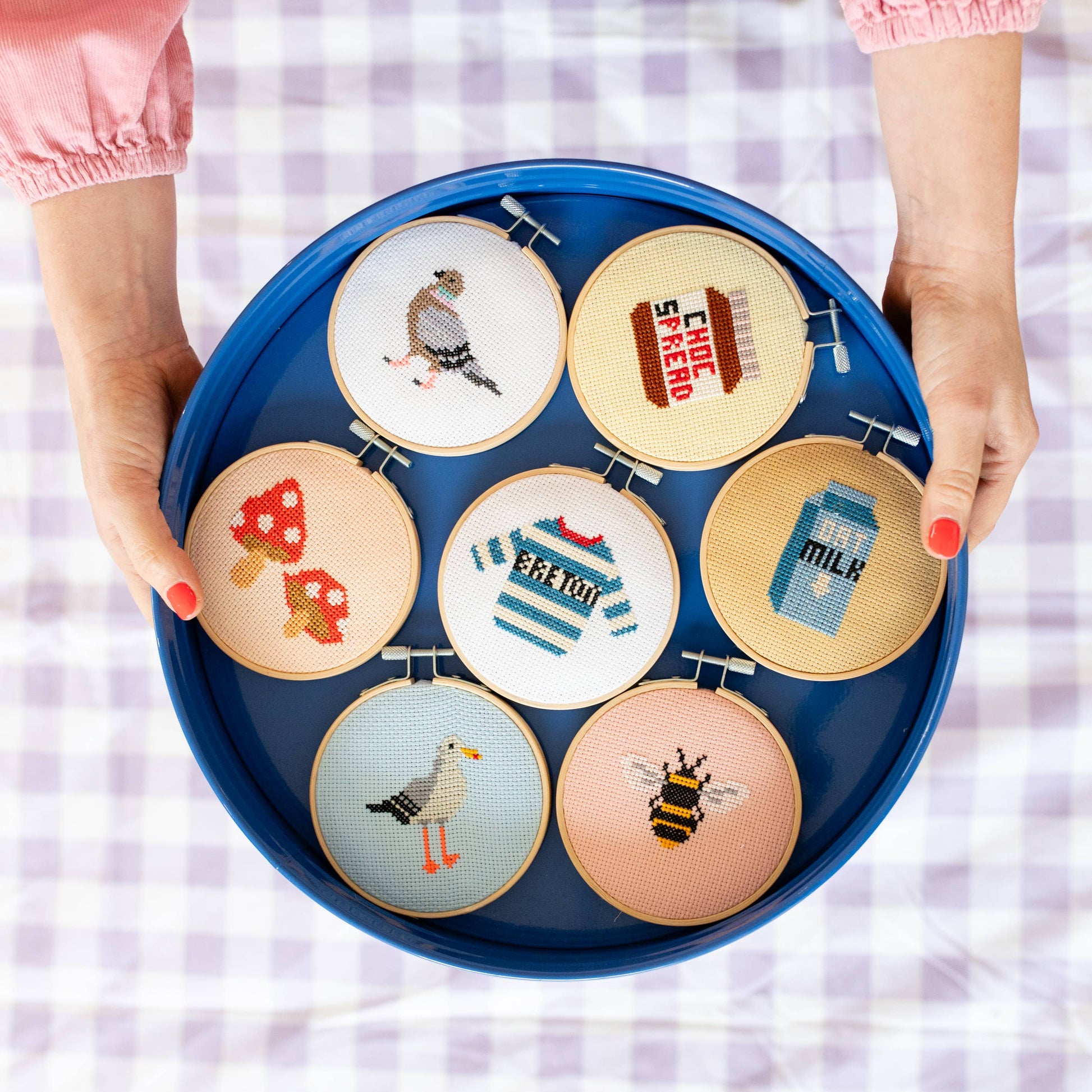 The finished design makes charming wall decor and is a great way to celebrate our favorite garden pollinator. Each eco-conscious kit includes everything you need: 11cm (4.3") embroidery hoop, colored Aida fabric (not pre-printed), pre-sorted embroidery thread, blunt-tipped needle, wadding, full instructions, and a backing disc for easy finishing.