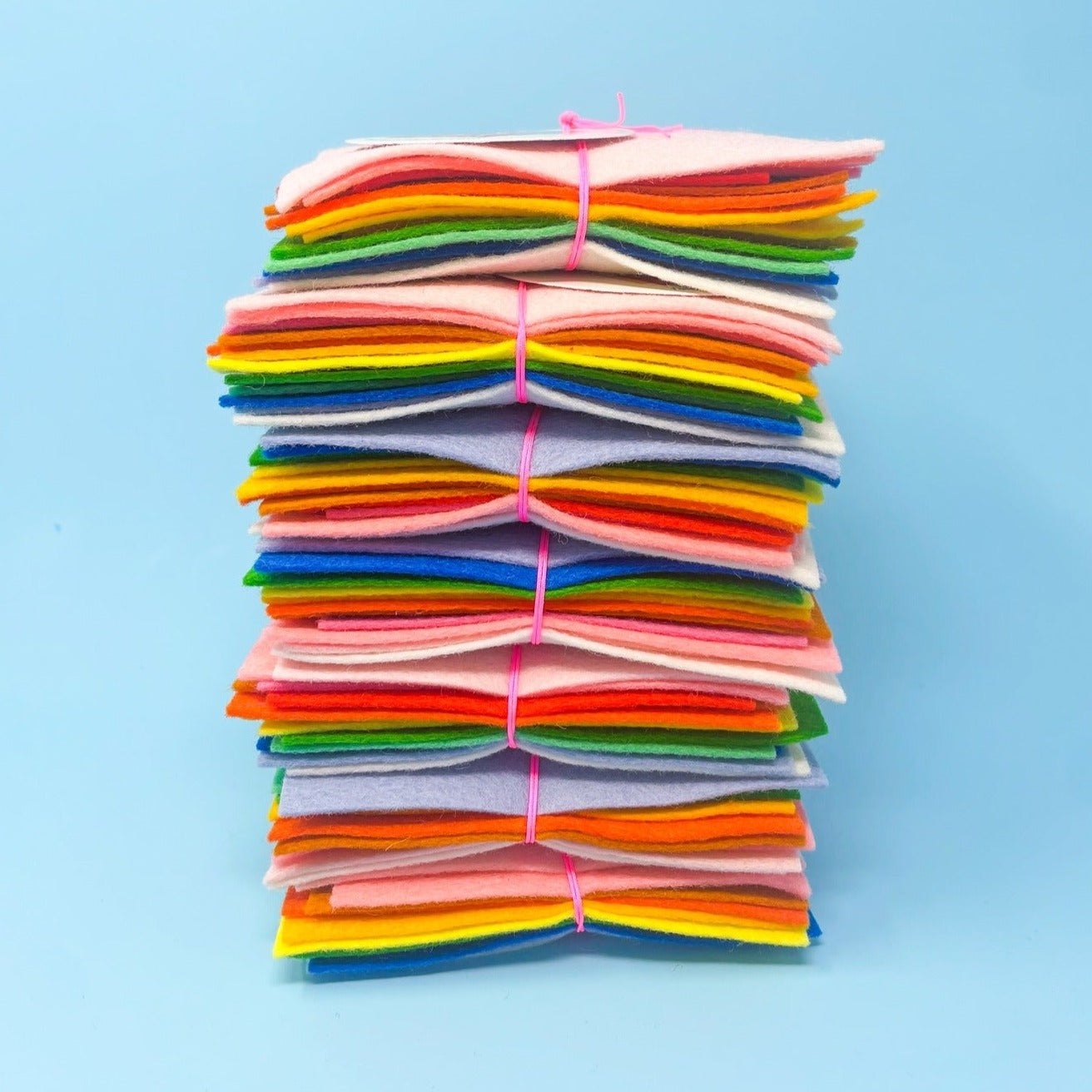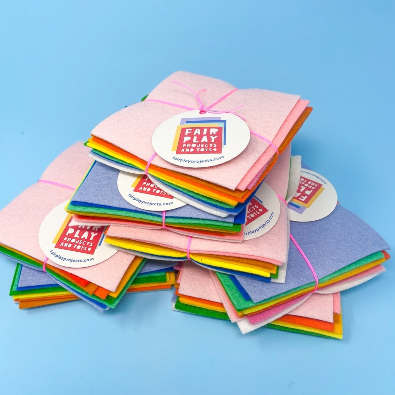A rainbow of fourteen pieces of 100% wool felt. Each piece is 4" square. This is an essential crafting supply, it cuts like paper and sews like fabric! Create doll clothes, decorations, or add felt embellishments to anything. The only limit it your imagination!