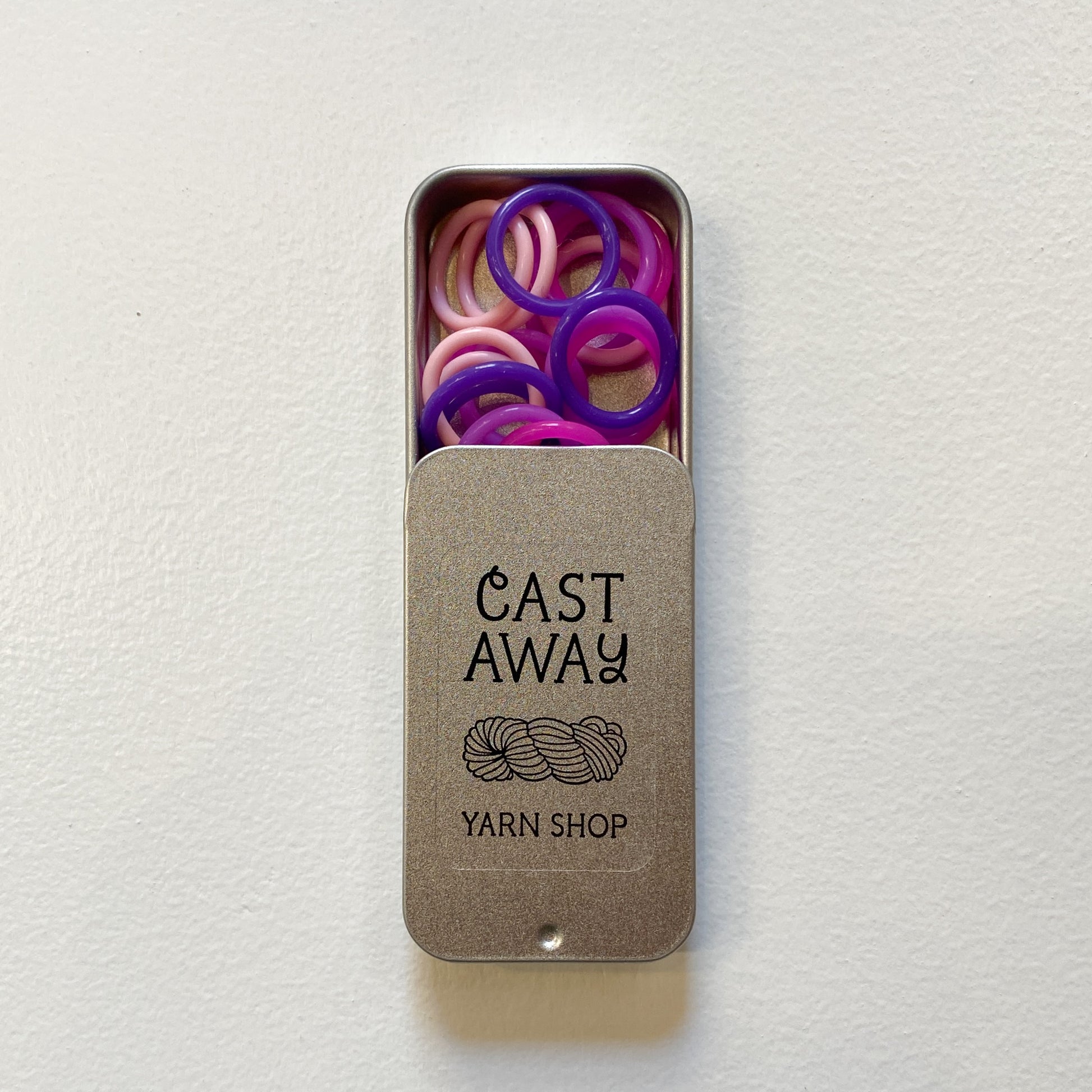 This is a pink/purple color pack in a slide top tin storage container to keep your stitch markers together.