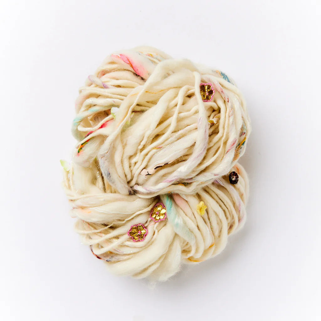 In Dreamland, various colors of wool, mohair, and sparkling Angelina fibers are hand carded together to create beautiful heathered colors. The fiber is then hand spun with tiny flower trims, sequins, bits of lace and ribbon rosebuds. Fluffy, lightweight and a touch slubby, this yarn conjures up thoughts of fairytale dreamscapes and secret gardens. Each color combination has its own unique set of trims and colors.