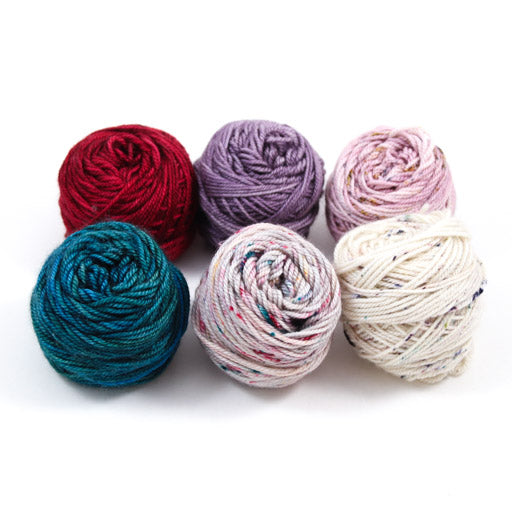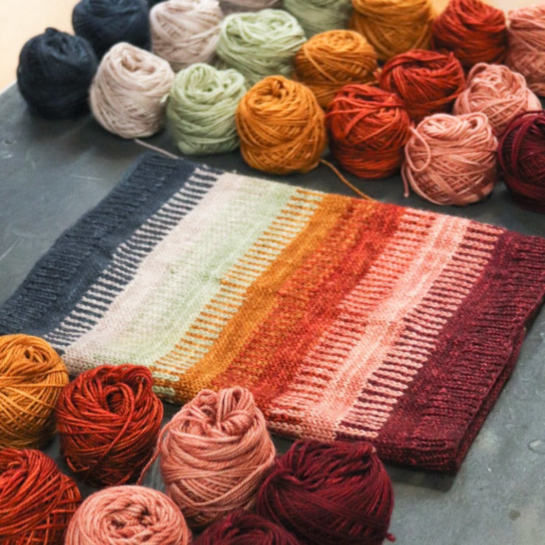 Kit includes 6 or 7 (depending on which colorway you choose) mini balls of 6 or 7 different colors of Pashmina. You will need US 4 & 5 knitting needles in a 16" or 24" length.
