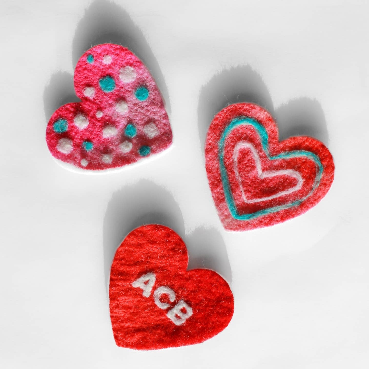 This personalizable craft kit is the perfect size for Valentine’s Day gift giving. A wonderful project for eye-hand coordination and inspiring creativity! A high quality and approachable Needle Felting Craft Kit that invites beginners to experience the joy of felting wool. Following simple instructions, crafters needle felt decorations and initials on pretty wool heart shapes. They will find enjoyment beyond honing the craft itself, as they can string the finished hearts and wooden beads together to make a cute wall hanging or use as individual ornaments.