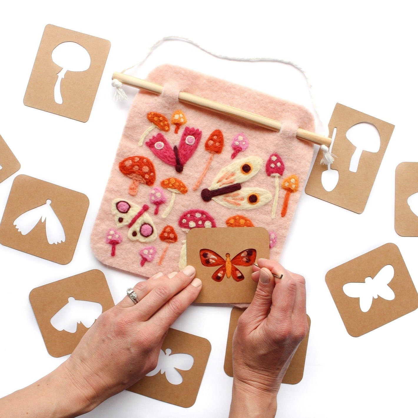 A high quality and approachable Needle Felting Craft Kit that invites beginners and beyond to experience the joy of felting wool. Following simple instructions and using sturdy cardstock stencils as their guide, crafters will needle felt whimsical moths and mushrooms onto an 8x8", ready-to-hang, 100% Wool Banner. A wonderful gift whether in kit form or the finished banner.