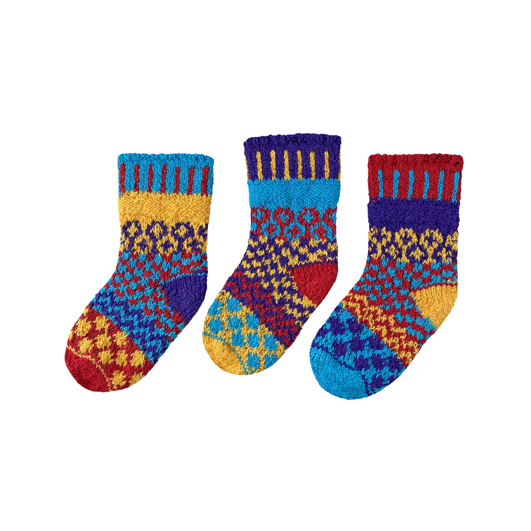 Colors in this sock: red, turquoise, yellow, purple.